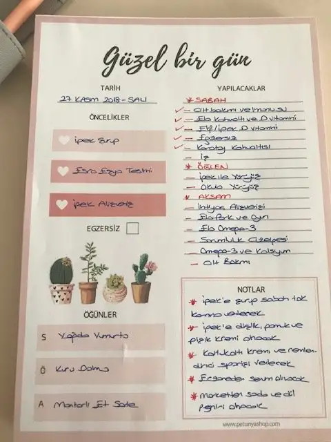 Bir tane aylık takvimim var, tüm ayı topluca görebiliyorum. Haftalık takvimde o hafta hedeflediklerimi yazıyorum. Günlük planlarda o gün halledilecek işleri listeliyorum. Alışkanlık kazanmak istediklerimi habbit trackerda takip ediyorum. Ayrıca gerçekleşen bütçemi kaydettiğim bir sayfam var. O ay hangi kaleme toplam ne kadar para harcamışım onu yazıyorum. Bir de o ay okunan kitap listesi sayfası ekledim. Şimdilik sistem oturmuş gibi görünüyor. Böyle devam ederim umarım.