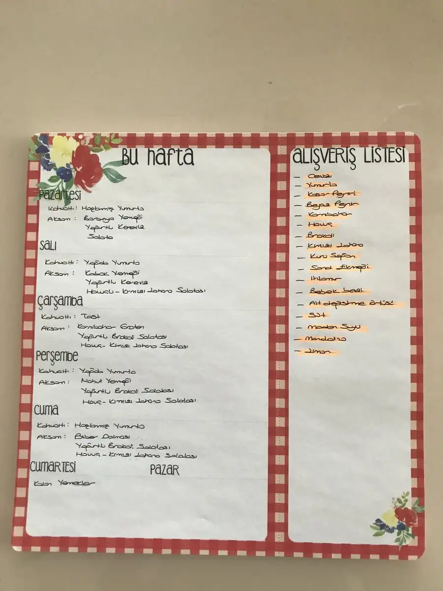 Bu haftanın yemek planlaması ve bu doğrultuda hazırladığım ihtiyaç listesini ekliyorum. Markete gidildi, çiftlik ve cevizhane siparişi verildi. O zaman bu hafta bir daha gıda alışverişi olmayacak demektir.