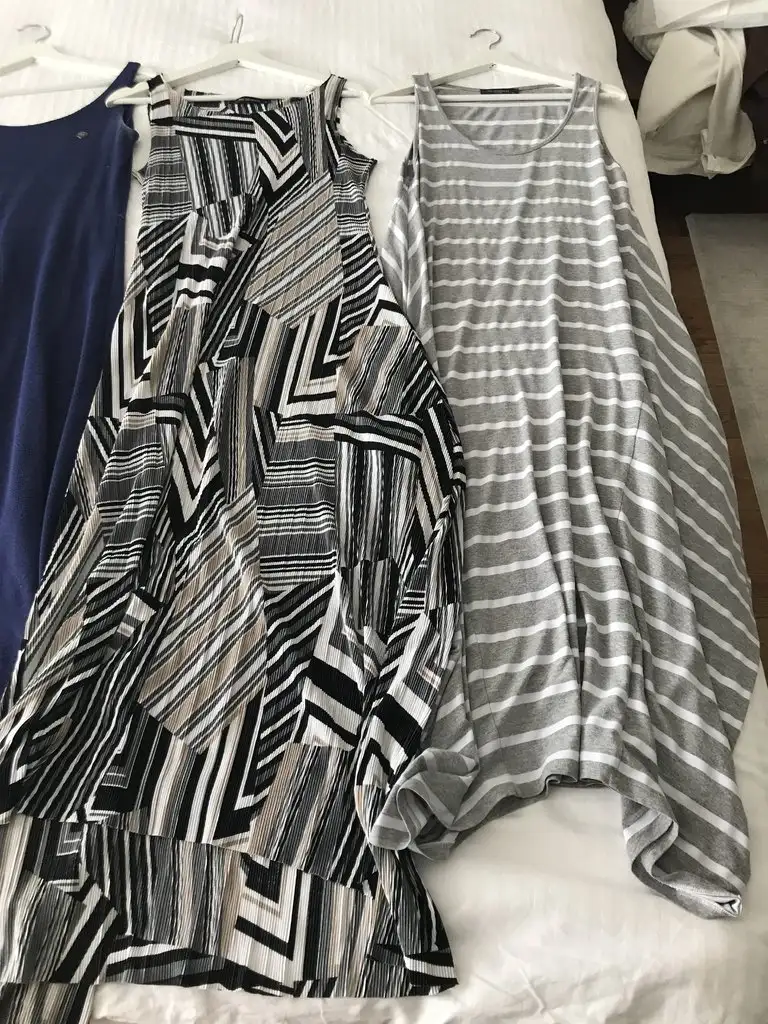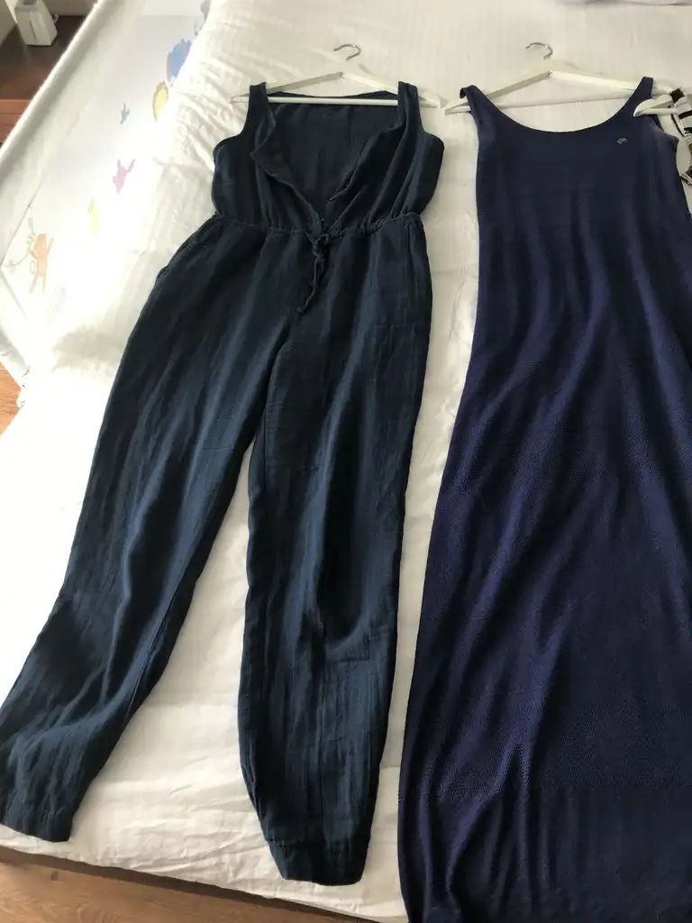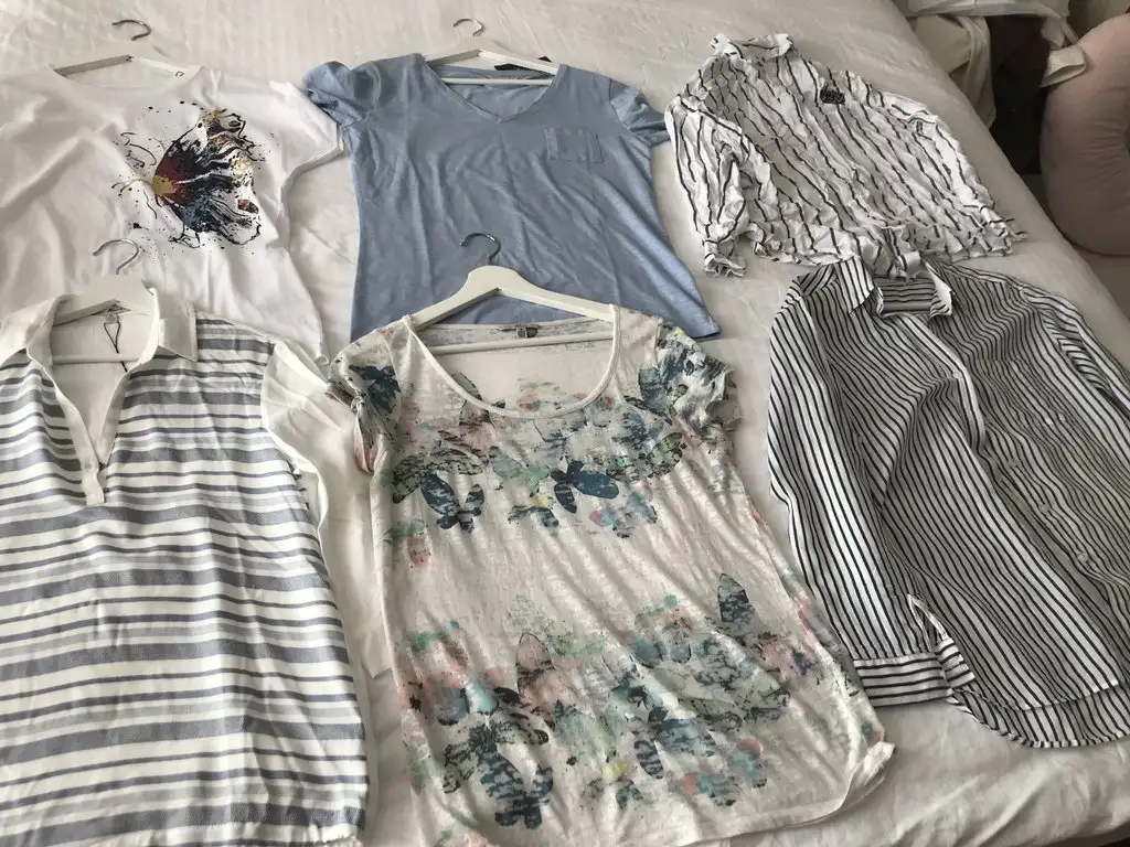 Yaz sezonu için 3 gömlek, 3 tişört, 4 pantolon, bir tulum ve 3 elbisem var. Özel günlerde giymek için 2 kıyafetim var. Dış giyim olarak 2 montum, 2 ayakkabım ve bir çantam var. Hepsini ekliyorum.