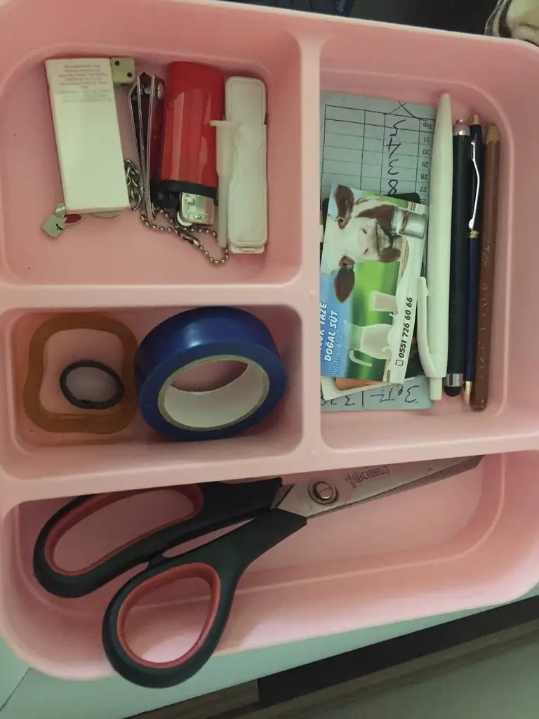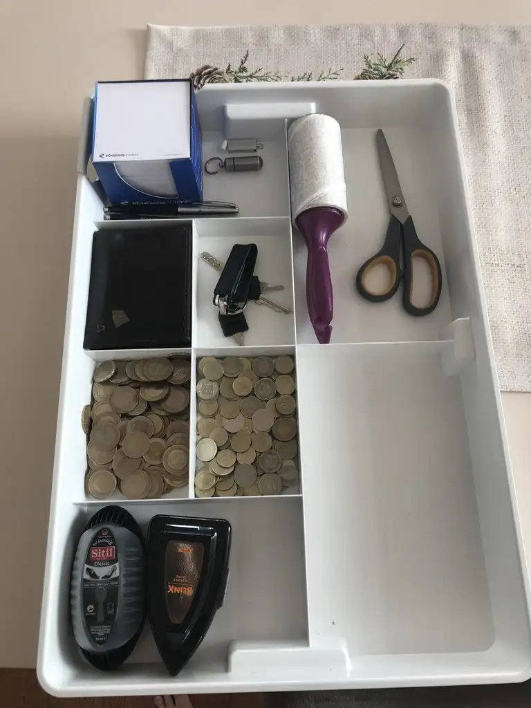 Onun altında eve gelir gelmez anahtar, cüzdan vs koyduğumuz, eve gelen kargo ve suyun ödemesi için belirli bir miktar nakit para cüzdanda duruyor. Bu alan evdeki tüm anahtarların bulunduğu yer aynı zamanda.