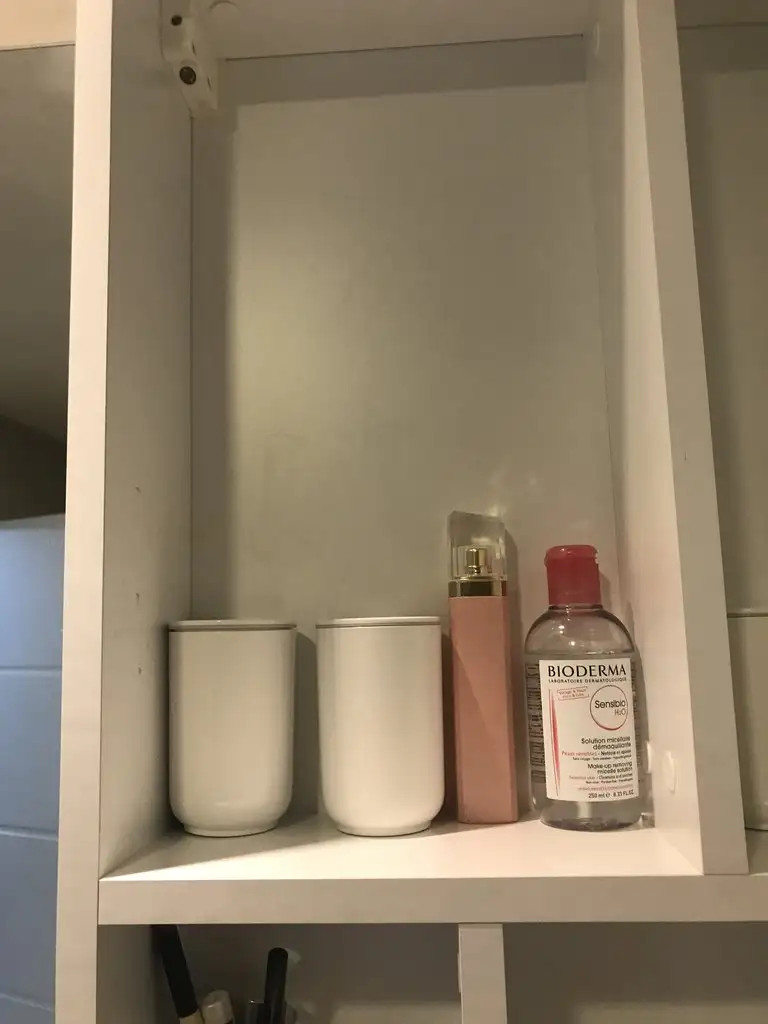 Banyo dolabının en üst rafı ile sol taraftaki dar raflar bana ait. En üst raftaki beyaz kutularda makyaj pamuğu ve kulak pamuğu var. Yanında sahip olduğum tek parfüm ve makyaj temizleyicim duruyor.