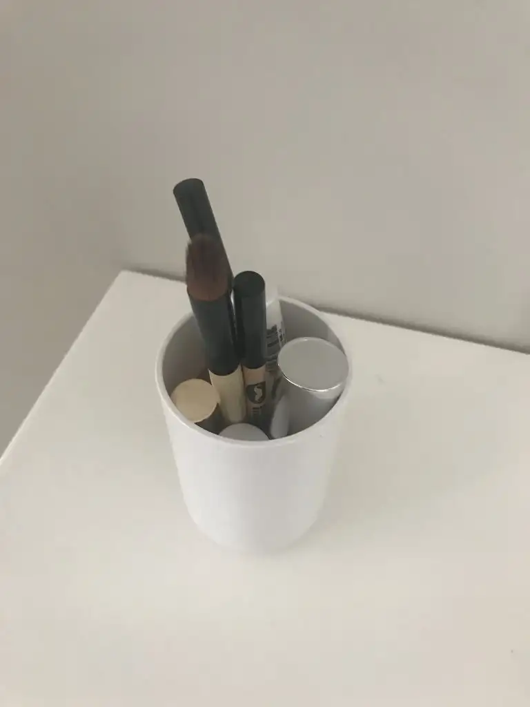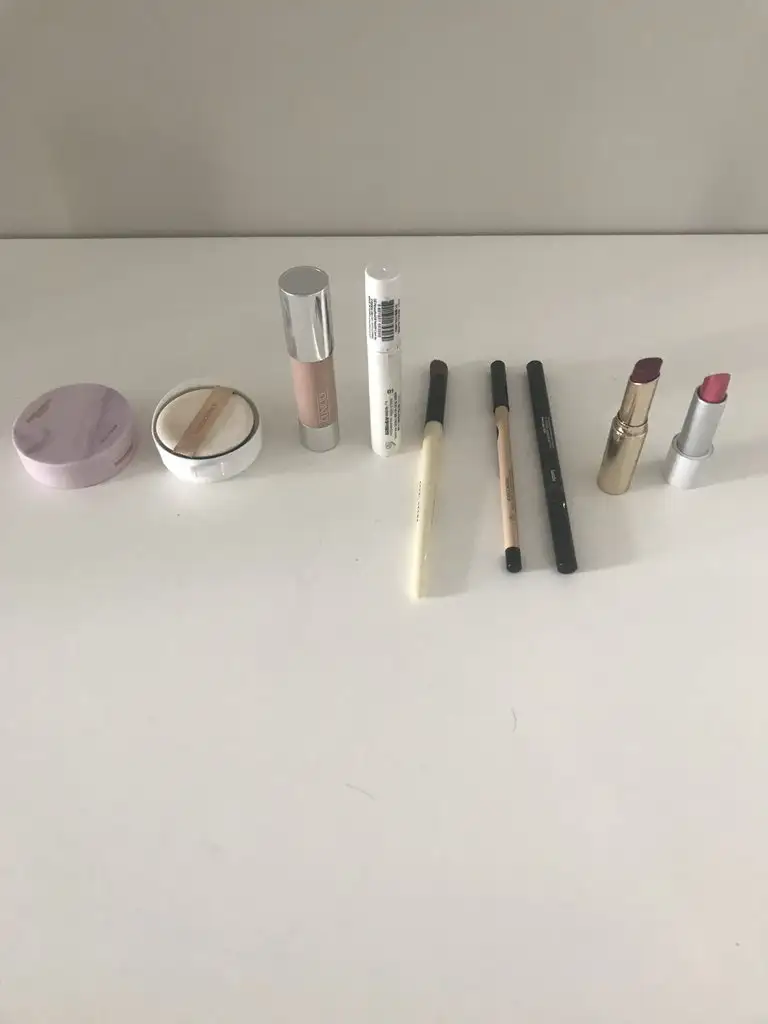 Bir alt rafta makyaj malzemelerim var. Beyaz kutunun içeriği ile birlikte tüm makyaj malzemelerimin fotoğrafını çektim.
