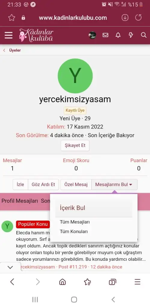 Kullanıcı adına tıklayın sonra mesajlara tıklayın sonra açtığı konular yazacak