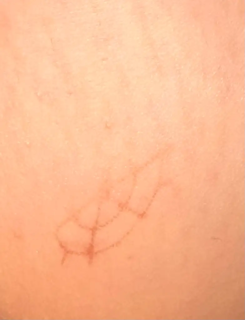 İz çıkaracak bir şeyim yok ki . Ki iz olsa çoktan geçerdi bencePembe ve kabarmış bir görüntü olsa demografizm olması mümkün derdim ama bu kabarık değil kahve düz çizgi. Muhtemelen koltuk,yatak gibi bir yerden sert bir cisim izini çıkarmış oraya. Ben de yarım gemi dümeni gibi bir şeye benzettim.