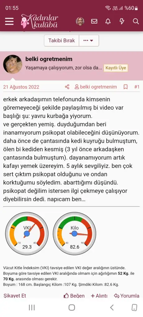 ve gerçekten yemiş. duyduğumdan beri inanamıyorum psikopat olabileceğini düşünüyorum. daha önce de çantasında kedi kuyruğu bulmuştum, ölen bi kediden kesmiş (3 yıl önce arkadaşken çantasında bulmuştum). dayanamıyorum artık kafayı yemek üzereyim. 5 aylık sevgiliyiz. ben çok sert çıktım psikopat olduğunu ve ondan korktuğumu söyledim. abarttığımı düşündü. psikopat değilim istersen ilgi çekmeye çalışıyor diyebilirsin dedi. napıcam ben…