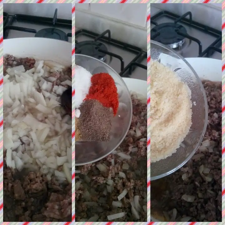 bir yandan da iç malzemezi pişiriyoruz.hepimizin bildiği gibi önce kıymamızı kavurup ince doğranmış soğanımız ekliyoruz piştikten sonra baharatları ekliyoruz...tavamızı ocaktan alır almaz yumuşamış bulgurumuzuda ilave ediyoruz...