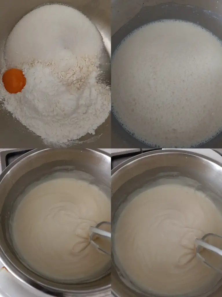 Tencereye nişasta, un, toz şeker, yumurta sarısını alalım.