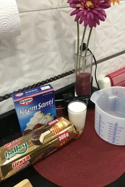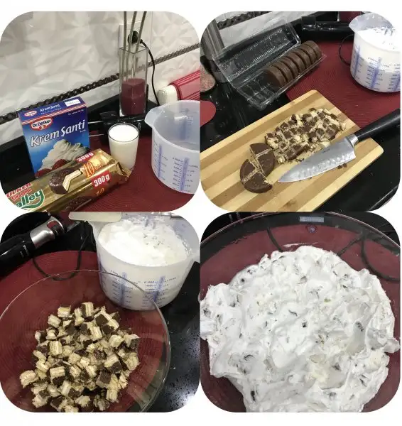 1 Bardak soğuk sütümüzü toz krem şanti ile iyice çırpalım.. 10 lu Halleyleri bıçakla önce ikiye,sonra dörde bölüp daha sonra biraz daha ufaltalım. Çarptığımız kremşantinin içine kestiğimiz halleyleri ekleyip spatula ile karıştırılalım. Dolaba koyup bekletelim