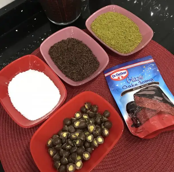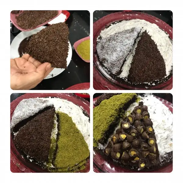 Pastamızı süslemek istediğimiz malzemeleri kaplarda hazırlıyoruz.. Çikolatamızıda sıcak suyun içinde eritip bir tabağa döküyoruz. Dilimlenmiş kekleri sırayla önce erimiş çikolataya sonrada pasta süslerine sırayla batırıp pastamızın üzerine diziyoruz..
