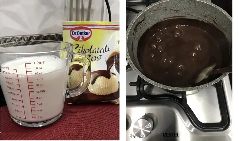ÇİKOLATA SOS: 1 Adet Dr Oetker çikolata sosunu 400 ml. Süt ile pişirip soğumaya bırakalım..