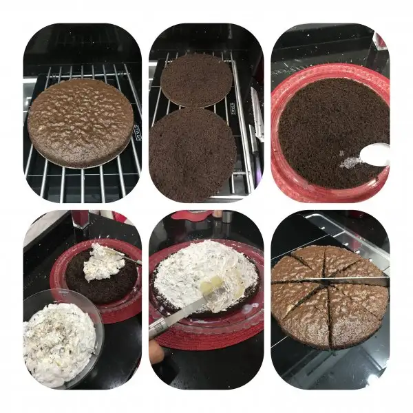 Öncelikle soğumuş kekimizi kalıbımızdan çıkartıyoruz. Ortadan ikiye kesiyoruz.. Alt tabanını pasta servis kalkına koyup üzerini süt ile azıcık ıslatıyoruz :)) Buzdolabında beklemiş olan halley ve kremşanti karışımı biraz tepe olacak şekilde pasta tabanımızın altına spatula ile düzelterek şekil veriyoruz.. Üst parçayı önce dörde,sonra sekiz parça olmak üzere bıçağımızla eşit şekilde kesiyoruz..