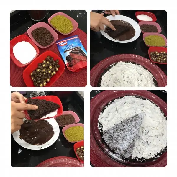 Pastamızı süslemek istediğimiz malzemeleri kaplarda hazırlıyoruz.. Çikolatamızıda sıcak suyun içinde eritip bir tabağa döküyoruz. Dilimlenmiş kekleri sırayla önce erimiş çikolataya sonrada pasta süslerine sırayla batırıp pastamızın üzerine diziyoruz..
