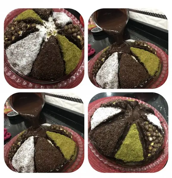 En son soğumuş olan çikolata sosunuda pastamızın en tepe ve orta yerinden yavaş yavaş dökmeye başlıyoruz...