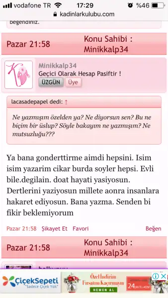 HEPİNİZ HAKLISINIZ HANIMLAR, BENİM SON GÜNLERDE MORALİM PSİKOLOJİM ÇOK BOZUK, SÖYLEMEMEM GEREKEN ŞEYLERİ SÖYLEDİM, HAKARET ETTİM VE ÜZERİME DÜŞMEYEN YORUMLAR YAPTIM. @lacasadepapel SİZİNLE HİÇ ALAKASI OLMAYAN BİR MEVZUYU SİZİNLE İLGİSİ VARMIŞ GİBİ SÖYLEDİM. HAKLISINIZ ÖZÜR DİLERİM. DAHA AÇIK NASIL ÖZÜR DİLEYEBİLİRİM