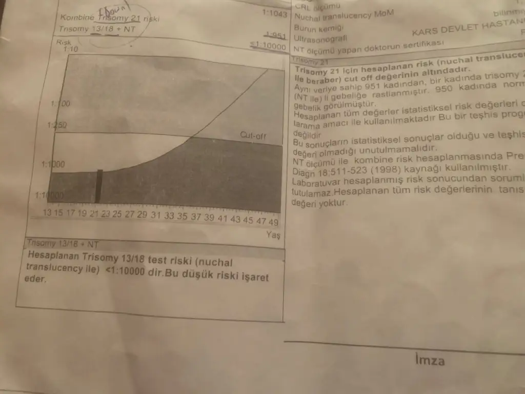 O diğer şeyler için 13 18 yazıyor ya onlar için, halamın kızının birebir aynı durumu olduğu için biliyorum defalarca beraber doktora gittik onun yaşı dolayısıyla 350 de 1 falan diyordu kordosentez mi öyle bir şey yaptırmıştı 3 4 sene oldu o zaman fetal dna bilinmiyordu sonra normal çıktı çok şükür . Bu tarama testlerinde birden fazla hastalığa bakılıyor sende 951 yazan riskli kabul edilmiş 13 18 yazanın riski yok kabul edilmiş. Sanki 1500 de 1 gelenden itibaren mi ileri test yapılıyordu tam emin değilim üzerinden zaman geçti ama dediğim gibi bu sadece riski ortaya koyuyor bir tanı koymuyor fetal dna ile bebeğin dna sı tamamen inceleniyor inşallah hiçbir sıkıntı çıkmaz 🌸