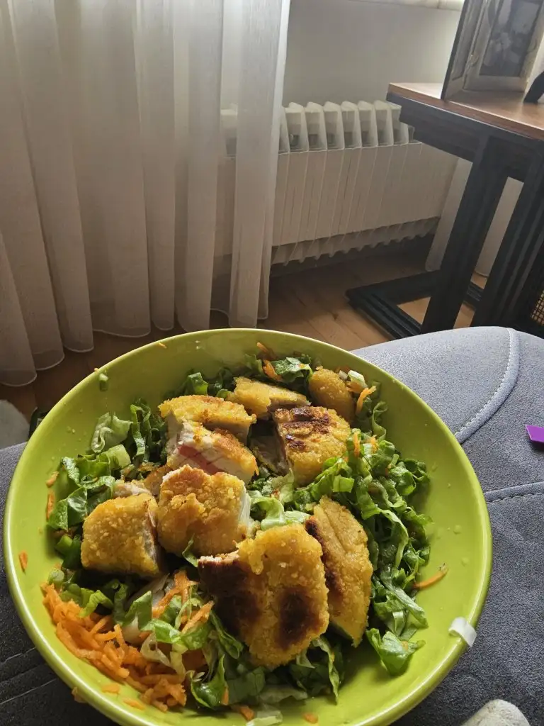 Nefis gorunuyorOglen yemegim 2 tane şinitzel ve salata. aksam acikmazsam yemek yemeyi dusunmuyorum. Sadece 8 gibi sebze smootie yapıp icine yulaf koymayi dusunuyorum.