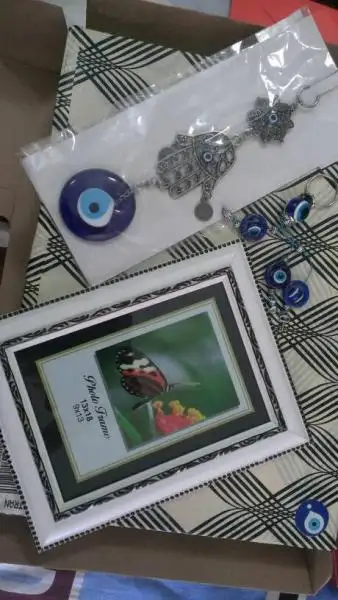 hediyelerin üstüne yapıştırdığı nazar boncukları ayrıca hoşuma gittiçok severim öyle nazar boncuklu süsleri gözlerim parladı görünce