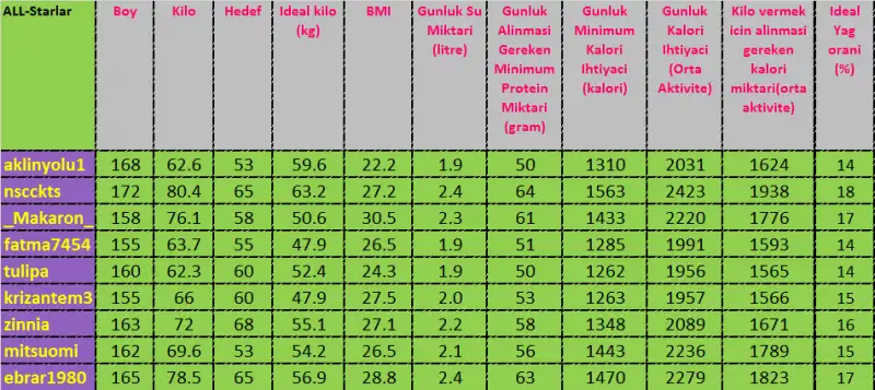:Yoo canim ilk sayfada degistirdim. Buradaki hedef yarisma sonu hedefi degil. Diyeti birakacagimiz zaman ki hedefler. 58 olmazsin korkma.
