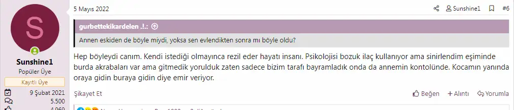 vardır illaki. belki konu sahibininki de böyledir. ben genelde çift yönlü bakmayı sevdiğim için arada eksiklikler var diye yazdım konu sahibine. ama sorunlu bir kişi ise yenge zaten her türlü mesafe şart. oğlu memnun demekki, yenge ile de mutlu. ben konu sahibinin annesinin yerinde olsam gerçekten karışmam. gidip gelmem. gelmek isterlerse gelirler. lazımsın bize gel derlerse anca giderim. yani çok alttan almam bana söyleneni. ama karşı tarafında özel işine müdahale etmem. şu aşamadan sonra ben olsam mesafe koyarım. kendi bilecekleri iş. oğlumla gün içinde işteyken konuşurum mesela gerekmedikçe gece aramam. yani yenge ile oğlunun tercihi bu oğlu da memnun ki eşine ses çıkarmıyor. ne yapacaksın ki! ama yengenin parmağında da oyuncak olmam.