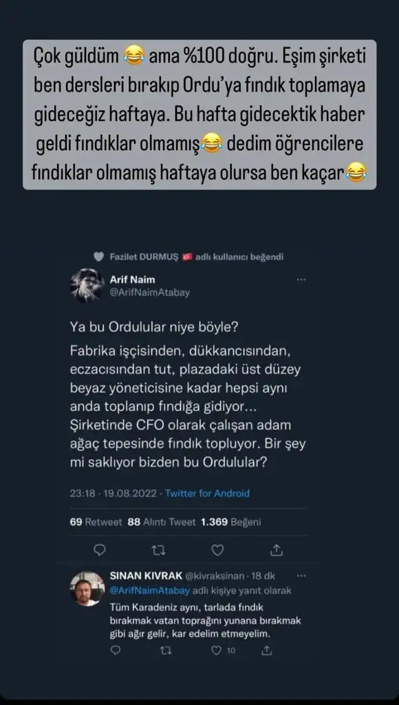Konu sahibinin sayesinde eşi işten tüymüş bu sene işte, hep de böyle olacak, kayınbabaya bedava ırgat olacaklar millet tatilde şezlong kavgası ederken konu sahibi akşama kadar fındık toplayıp akşam da kayınbabanın bet suratını çekecek. Kocası sırayı savdı, miss.Geçen sene sensiz toplamışlar fındıkları. Demek ki sensiz oluyor. Seneye eşin gitsin tek başına