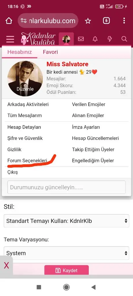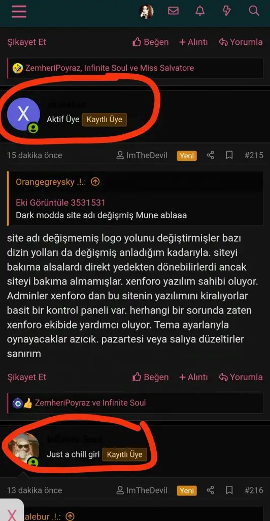 Mune hanım ben siyah moddan çok memnunum. Tek sıkıntı siyah modda turuncu ve kırmızı renkli olmayan üye isimlerinin görünmemesi. Ona bir düzenleme yapabilirlerse harika olur. Düzenleme yapılmıyorsa da bu şekilde kullanmaya çalışırım. Eki Görüntüle 3531565
