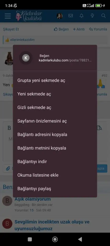 beğen butonuna uzun basınca habire bağlantıyı kopyala gibi seçenekler çıkıyor