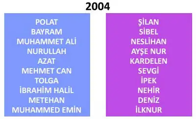 2004 yılı meşhur Nehir'in listeye girişini gösterirken, erkeklerde Mehmet Can ve İbrahim Halil hala listede yer almaya devam ediyor. Polat'ın artışı Kurtlar Vadisi'ne bağlanabilir mi sizce? Acaba Şilan'ın anlamı ne?