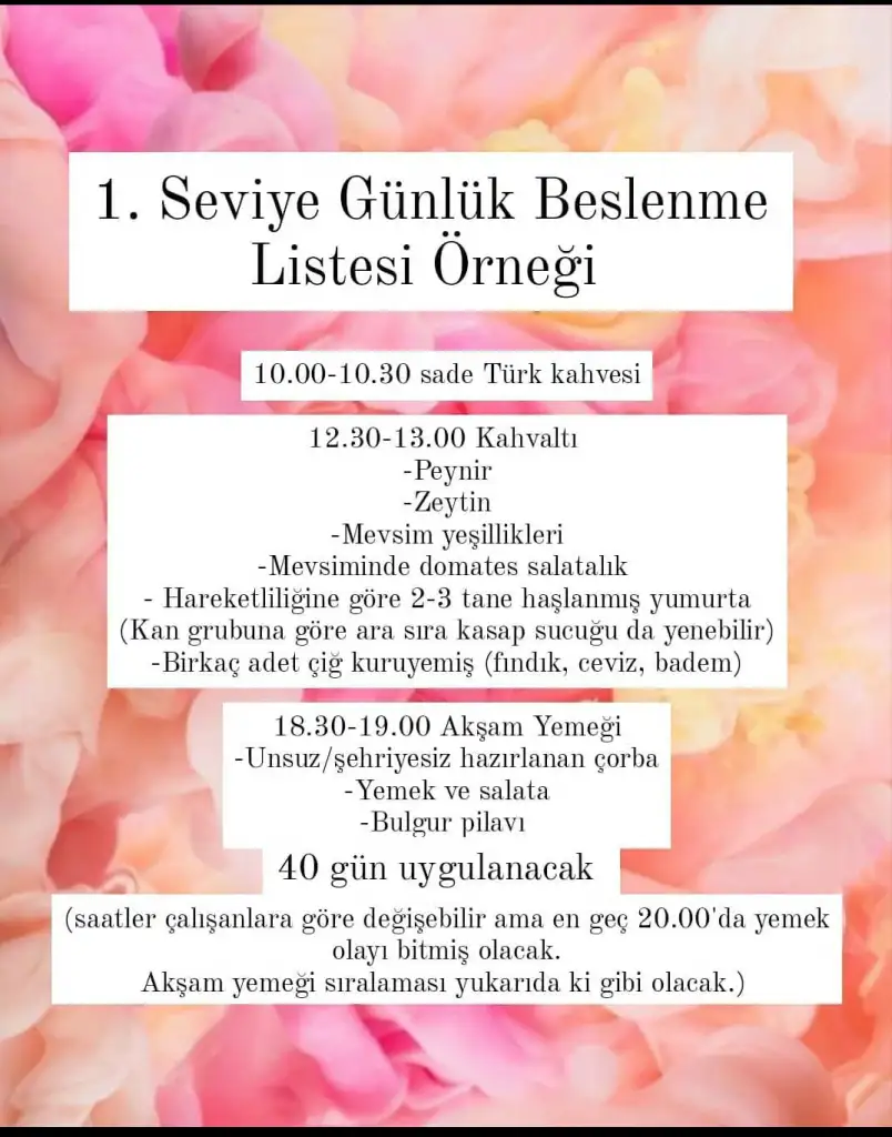 8- Seviye-1 bitene kadar limon ve avakado hariç hiç bir meyve yok. Hurma ve kuru meyvelerde dahil (kuru kayısı, kuru incir, kuru üzüm vb.) Seviye-2’de hurma ve incir öğlen öğününde geri gelecek. Metabolizmamız normal haline dönünceye kadar ise diğer meyveler program boyunca yasaktır. Seviyeler tamamlanınca hepsi geri gelecek korkmayın.