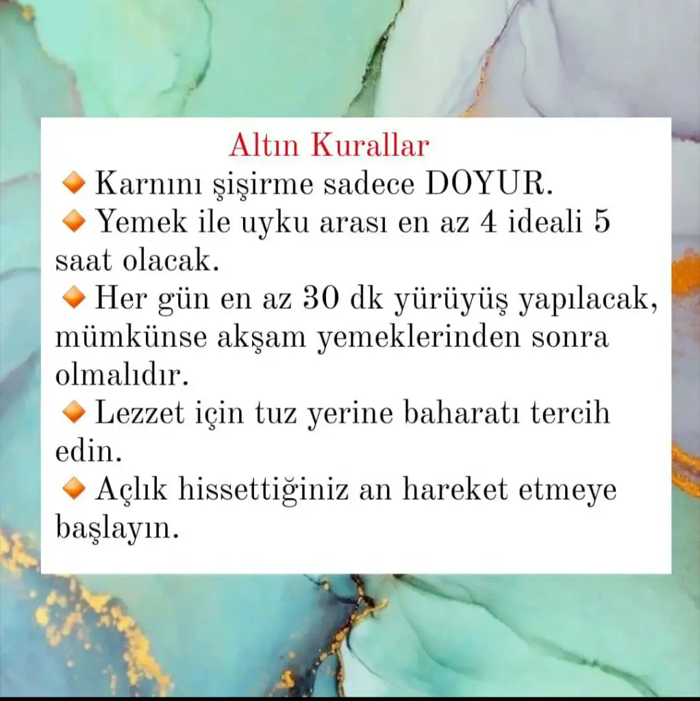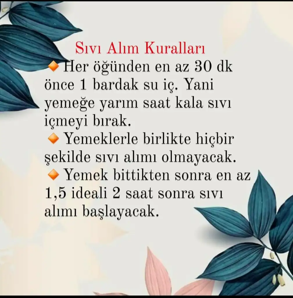 3- Yemekten en az 1.5 saat ideali 2 saat sonra su, çay, bitki çayı yada türk kahvesi içebilirsiniz. Bu maddelere sıvı alım kuralları deniyor. Grupta sebepleri ile birlikte detaylıca anlatmıştım.