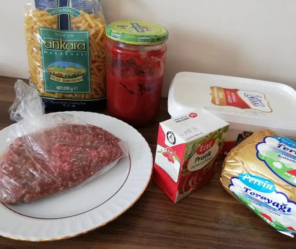 Makarna haşlanırken 1 kaşık tereyağı koyduğumuz tavada kıymaları karıştıra karıştıra kavuruyoruz. Kırmızı rengi kaybolduğunda fazla kurutmadan salça ve domates püresini ekliyoruz. Dilerseniz domates rendesi veya kışlık domates sosunuzla da yapabilirsiniz. Sosumuza 1 çay kaşığı tuz ve arzu ederseniz karabiber pul biber gibi baharatlar katabilirsiniz. Ayrıca eşim soğan sevmediği için soğan koymadım ama seviyorsanız öncesinde soğan da kavurabilirsiniz.