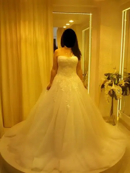 Merhaba kızlar, bir dikim evinde kafamdaki gelinliği buldum. Aynısını diktireceğim. Sadece etek kısmı sade olduğu için uçlarına incilerin olduğu ve yukarı doğru hafif dağıldığı zarif bir gupür eklenecek. Kuyruğunda ise aralıklı dağınık dağınık gupürler aşağı kadar iniyor. Spotlar sarı olduğu için çok sarı duruyor ama normalde rengi kırık beyaz, tül simli. Sorularım ise;