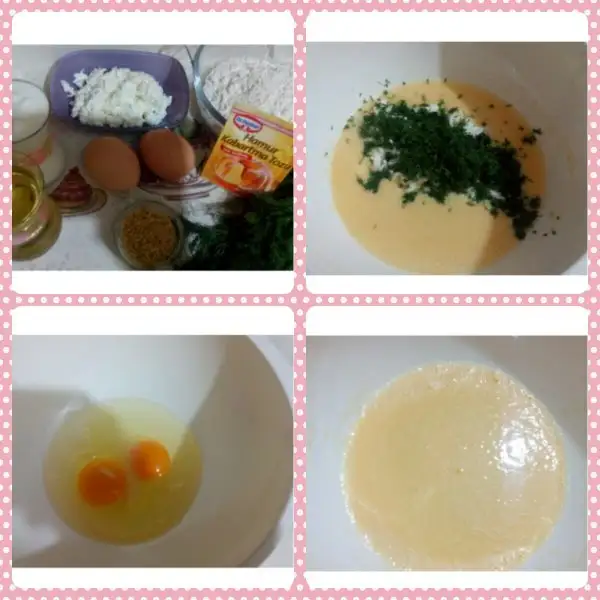 Rendelenmiş peyniri, ince doğranmış dereotunu ilave edip karıştırıyoruz. Unu ve kabartma tozunu eleyerek karışıma ekleyip karıştırıyoruz.