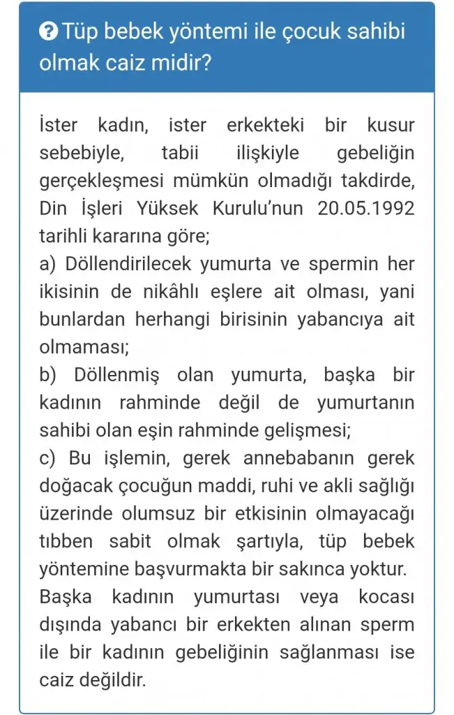 Bu yazı diyanet işlerinin sitesinden alınmıştır. Diyanet işlerinin Müslümanlik kuralları yönünden bu işe bakış açısı çok net, dinen caiz olmadığını kesin ve net şekilde söylüyor . Ama tabi ki herşey sizin kararınız, günah da sizin sevap da, sizin seciminiz.Merhaba arkadaşlar. Benim aklıma şu takildi bu sperm donasyonu yada yumurta donasyonu dinen uygun mu acaba tamam Kıbrıs takı hastaneler yapıyor ama Allah in rızası var mı bu işte hiç bu konu üzerine araştırma yaptıniz mi arkadaşlar
