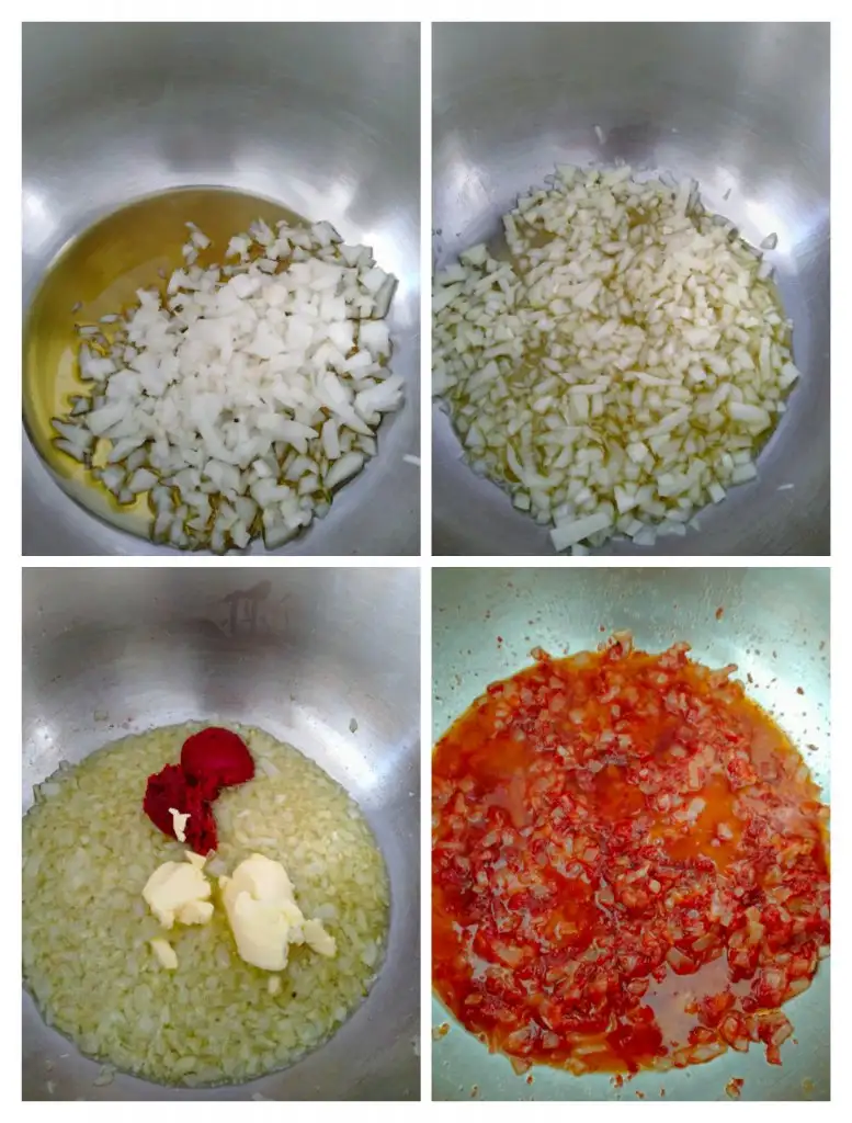 Kavrulan soğanları tereyağı ve salçaları ekleyip kavuruyoruz.