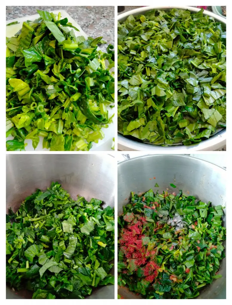 Daha sonra ıspanağı ayıklayıp yıkıyoruz.Sonra doğrayıp tekrar sirkeli suya koyup bir süre bekletiyoruz.Çok minik doğramıyoruz .Biraz iri olmalı