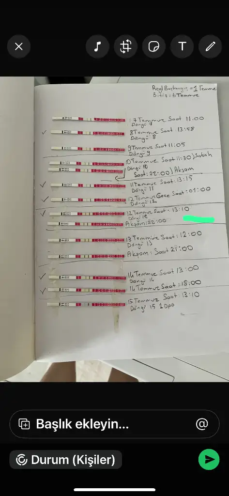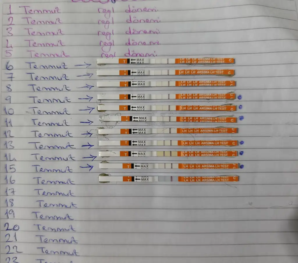 Yumurtlamaya az kalmışMerhaba arkadaşlar,aranıza yeni katıldım, gebelik istiyorum öncesinde buralara gelip sürekli insanların yorumlarını okurdum, ovulasyon testi almaya karar verdim bundan iki ay önce 5 haftalık bir düşük yaşadım. Şimdi ise ovulasyon testi ile takip ederek nokta atışı yapmak istiyorum. 1 temmuz regl başlangıcı idi. Döngü ise 27 gün düzenlidir. Testlere başladım ve foto yükledim umarım doğru yüklemişimdir. sorunum ise ayın 10 unda yumurta akı kıvamında dediğimiz akıntı başladı buna rağmen testlerde pik vs göremiyorum testlerde bi sorun olabilir mi başına gelen varmı? Testleri sabah sekiz dokuz gibi uyanıp ilk idrarı yaptıktan iki saat sonraki idrar ile yaptım. Ayrıca 10. Ve 11. Günü değerlendirdim tabi ancak kafamda soru işaretleri var, bu arada testim innovitanın sattığı aynı hassaslıkta olan arsima testlerden, yani üç gündür azalarak devam eden akıntı var testlerde pik yok. cevaplarınızı bekliyorum kızlar