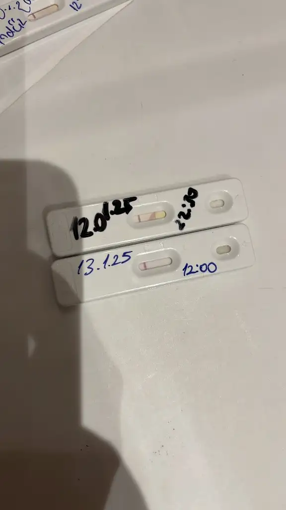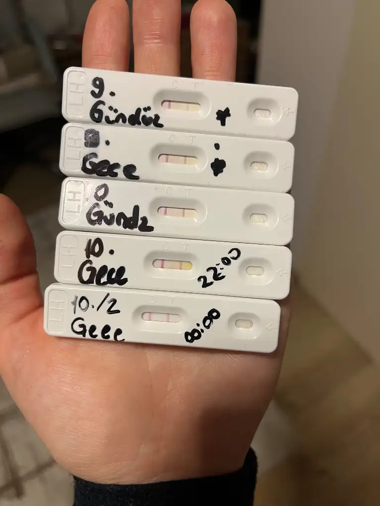 Düzensiz adet olurum. Bu ay takip ettim. Ve paylaştığım fotoğrafta test 9 da pik görmüştüm. 10. Gece(9.01.25) 00:00 yapılan test ve ertesi günü 11. Testte (10.01.25) çatlamayı görmüştüm. Ondan sonra testi bırakmıştım. Dün akşam kasık ağrı ve sızlama olunca 12. 01.25 22:30 testinde bu şekilde bulanık çizgi çıkmış. Testi yapıp silik görünce yatmıştım. Bu sabah gördüm. 13.01.25 tarihli testi bugün öğren 12:00 da yaptım çizgi görülmüyor ve kasık ağrımda öyle kalmadı.İki gün pik üçüncü gün çatlama olur canım pik olduğu günlerden sayarak üç günü değerlendir