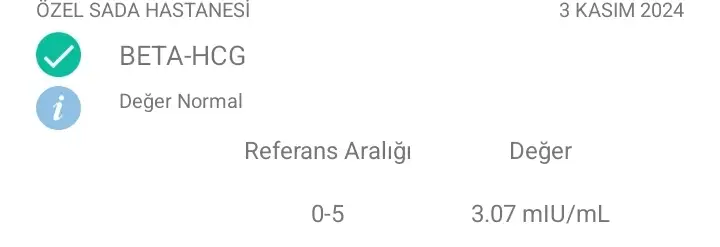 Bugün beta testi yaptırdım 3 çıktı. Ben anlam veremedim çünkü regl oluyor gibiyim bugün. akıntılar arttı. Tam olarak regl de denmez bu akintilara. Yani bütün gün pedim ustumde kalsa yarısı bile hatta çeyreği bile dolmaz öyle söyleyeyim. Ama neden regl günü 3 çıktı onu da anlamadım. Yaşadığım şey regl mi ondan da emin değilim zaten. Garip bir ay oluyor benim için.Varmi bisey cnm