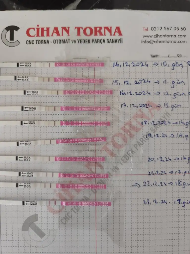 Amh im oldukca düşük. Yumurtalarım olgunlaşmıyor. Bu nedenle bu ay klomen kullanmaya başladım. Reglin 2. Günü sağ tarafında 8 mm büyüklugunde 4 tane yumurtam vardı ama sok tarafimda hiç göremedi doktorum. Reglin 5. Günü günde bir tane olacak şekilde toplam 5 gün kullanmam için klomen verdi 12. Günü kontrole gittiğimde başka bir doktor vardı baktı ve hiç büyümedigini 8mm sağ tarafimda bir tane yumurta olduğunu söyledi hatta ilacı kullandığına emin misin dedi. Ancak sol tarafimda da bir yumurta buldu ama o da küçük 8mm imiş. Bu ay olmaz dedi. Çok moralim bozuldu uzun zamandır hastanelere gidip geliyorum. Her kontrolde üzülüyorum. Ama ben yine de bu ay ovulasyon testime başladım ilk günler test çizgisi çok silikti ama sonra koyulasmaya başladı. 17. Ve 18. Gün test çizgisi diğer günlere oranla daha koyu oldu ama sanki kontrol çizgisine yakın değil ama yine de 16,17,18 günler hic olmayan akintim çoğaldı. Sağ ve sol kasığımda bayağı ağrı oldu bir sendir böyle olmuyordu Hatta 17. Gün akintida pembelik de gördüm. Ama doktorun ilk solda hiç yok deyip sonraki kotrolde var demesi kafamı çok karıştırdı. Ovulasyon testime bakar mısınız sizce yumurtlamam olmuş mu bu ay. Bugün akıntım yok mesela.
