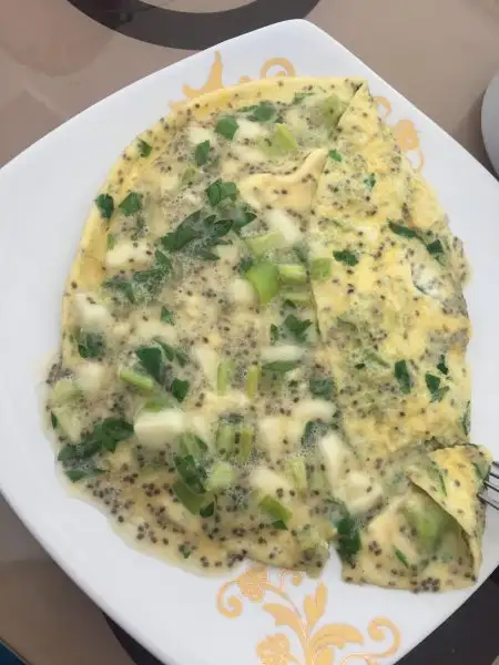 Bugün kahvaltıda chia lı, biberli, maydanozlu, peynirli omlet yaptım... hiç ekmek yemedim. Havuç, salatalık ve domates yedim yanında da 1 bardak süt içtim.