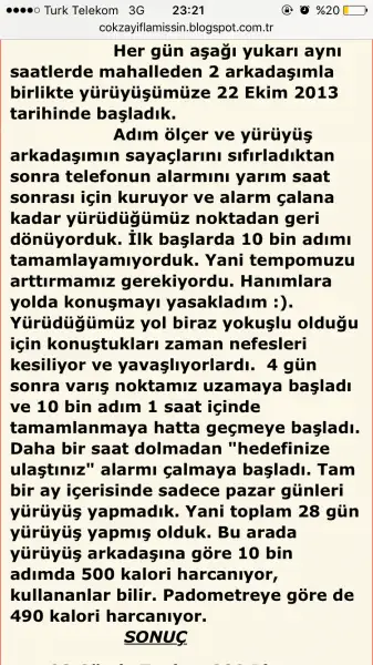 Valla işte ben yürüyüş yapamıyorum alıyorum bi bakıyorum bi anda hoop 2 kilo almışım.. yarın sınavlarım var onları atlatayıp bende bisiklete başlayacağım. Vermem gerekiyor eski günlerimi özledim vallaKısmet artık ne diyelim. Bakalım önümüzdeki zamanlara.. valla ben yemek yapmaktan kendimi alamadığım için yapıyorum ve yiyorum da. Gün içinde yürümesem demek kilo vermek yerine alıcam bide üstüne