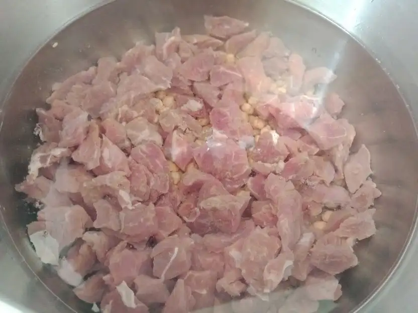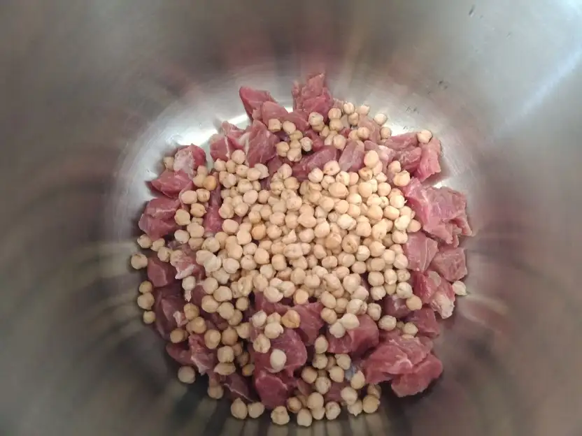 -Çorbamıza öncelikle bir düdüklü tencereye kuşbaşı eti , bir gün önceden ıslattığınız nohutu ve 8 bardak suyu koyup yaklaşık 35-40 dakika pişirin.