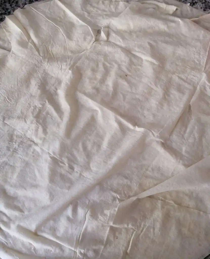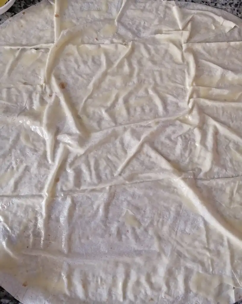 1 tane yufkayı açıp sosumuzu yarısı olacak şekilde üzerine sürüyoruz ardından 2.yufkayı koyup kalan sosu sürüyoruz 3.yufkayı ekleyip katlıyoruz