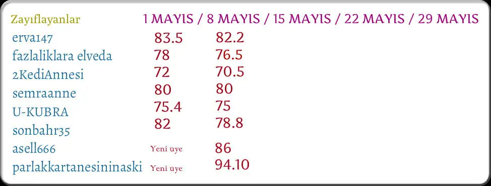 Kilolarımız ilk sayfada yazıyor kızlar. yarın yeni kiloları da ekliycem. 1. sayfadan kontrol edeblrsiniz hep...