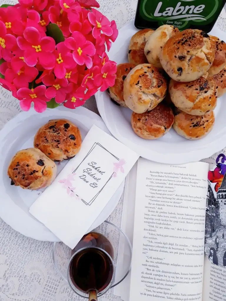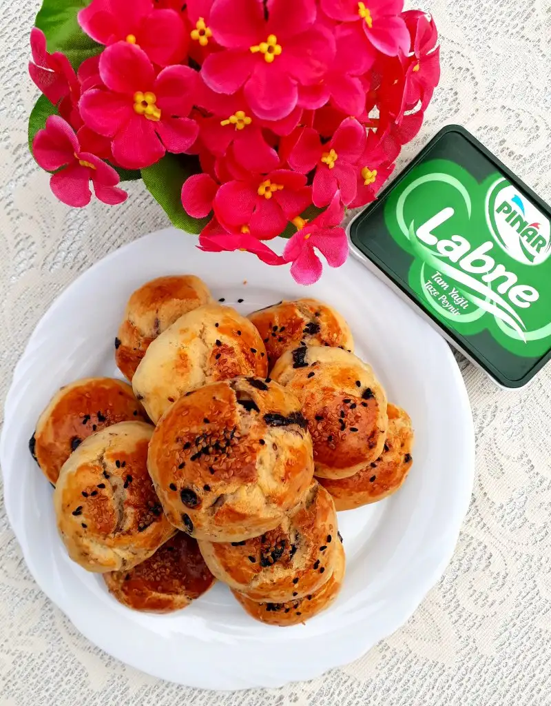 küçük parçalar alıp yuvarlak yapıyoruz ve tepsiye diziyoruz. Isterseniz hamura karıştırmadan da yaparsınız ama ben böyle sevdiğim için böyle yapıyorum. Üzerine yumurta sarısı, susam çörekotu döküyoruz. Önceden ısınmış fırında altı ve üstü kızarana kadar pişiriyoruz.