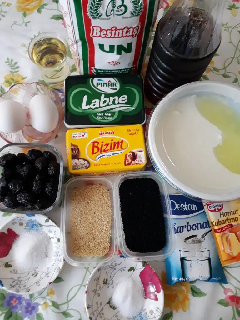 margarin, yumurta, yağ, yoğurt, labne, şeker, tuz,sirkeyi bir kapta karıştıyoruz. Sonra un, kabartma tozu, karbonatı katıp güzelce hamurumuzu ekliyoruz. Ele yapışmayan bir hamur elde ediyoruz.