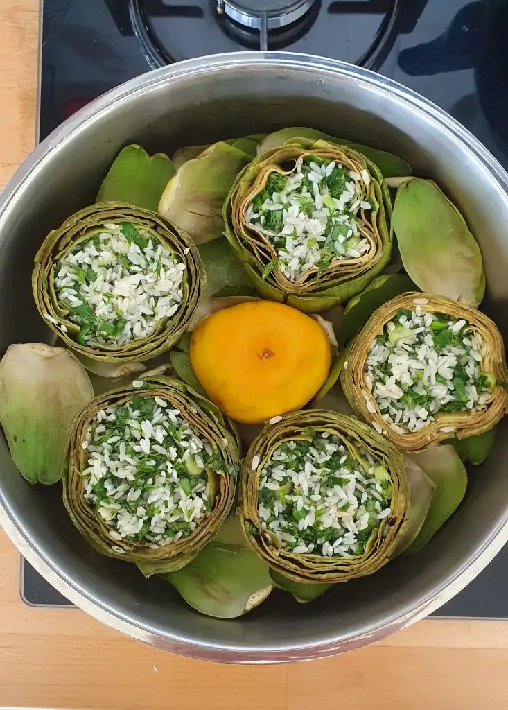 Şimdi tam zamanı iken enginarlı tarifler deniyorum. Sayısız faydası olan ,baharın müjdecisi enginarın en bildiğimiz hali zeytinyağlı enginar iken dolmasıda hem görsel olarak hemde lezzet olarak kesinlikle denenmeye değer..İlk kez geçen hafta 2 adet enginar ile denediğim bu tarifi öyle çok beğendik ki hemen tazecik bulduğum enginarlarla bugün yeniden fazlaca yaptım.