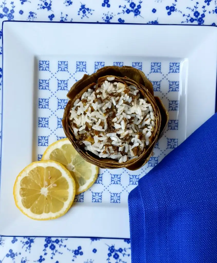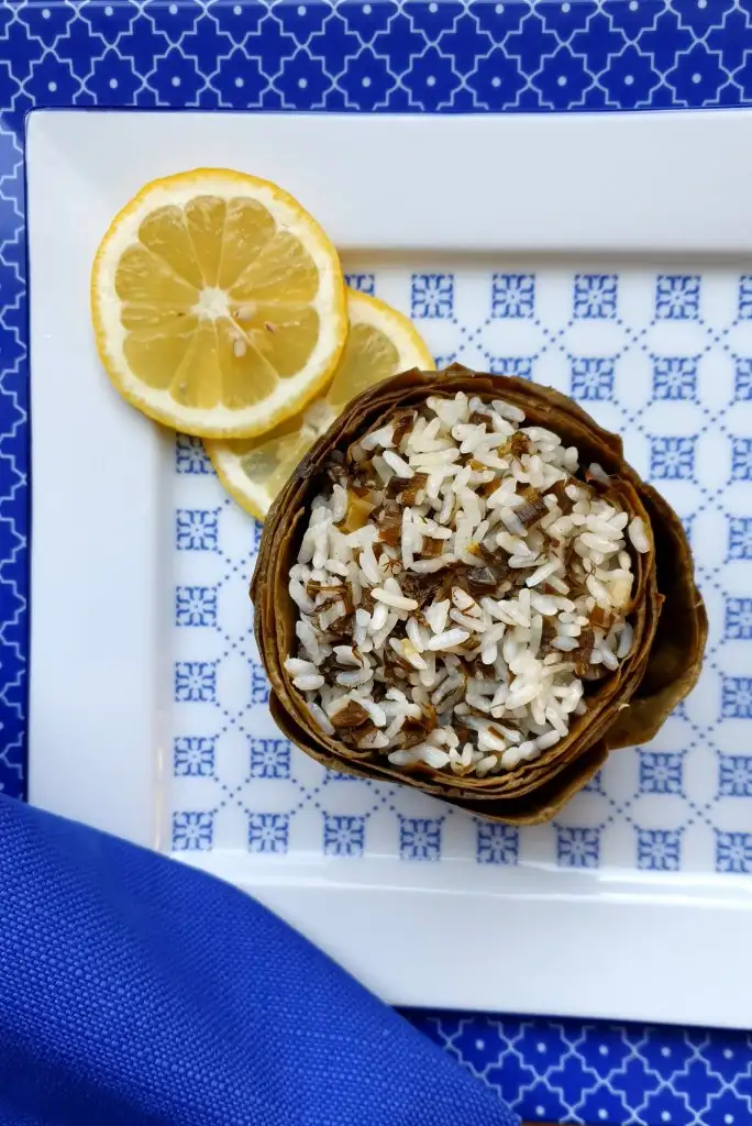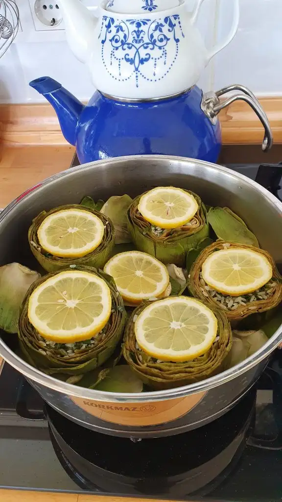 Geniş bir tencereye doldurulmuş enginarlarımızı yanyana diziyoruz. Üzerlerine limon dilimleri ekleyebilirsiniz. Suyunu(enginarların yarısına gelecek kadar),zeytinyağını,tuzunu ve limon suyunu ekleyip önce yüksek ateşte kaynamaya başladıktan sonra kısık ateşte enginar yaprakları ve pirinç yumuşayıncaya kadar yaklaşık 35-40 dakika pişiriyoruz. En dıştan bir yaprak kopardığınızda kolayca ayrılıyorsa pişmiş demektir...Ara suyundan pirinçlerin üzerine gezdirinki piriçler sert kalmasın..
