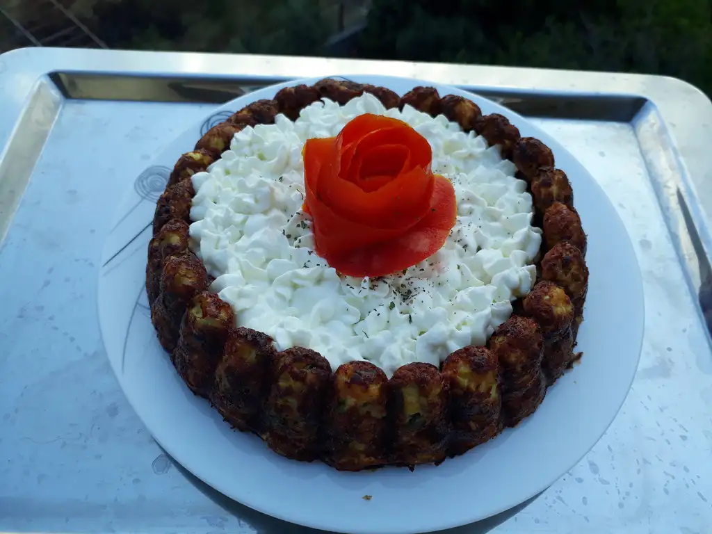 İlk sıcağı çıkınca sıkma torbasına koyduğumuz süzme yoğurt ile mücverimizi süslüyoruz.