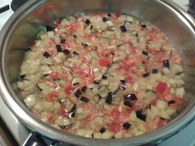 Eki Görüntüle 680119 Patlıcan ve kırmızı biber zar büyüklüğünde doğranır , tuzla ovulur ve kızartılır.